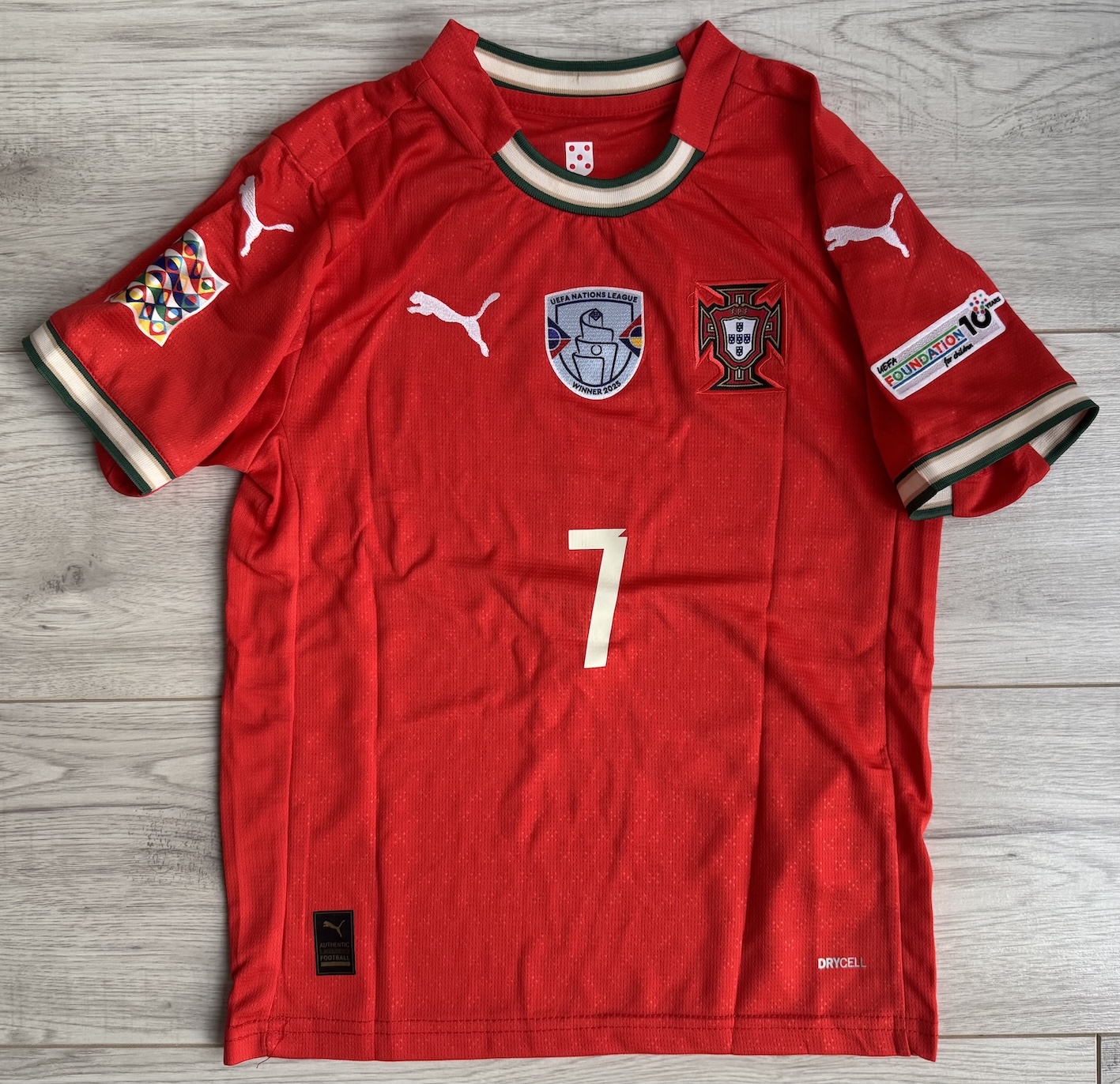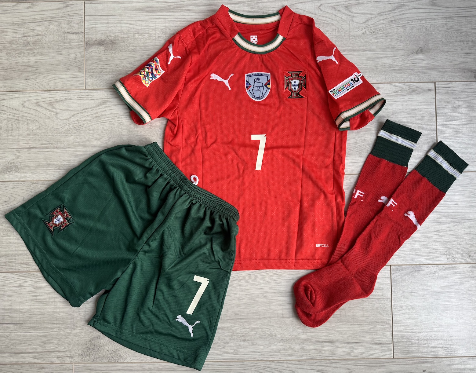 Na froncie znajduje się herb Portugalii, logo producenta oraz plakietka UEFA Nations League Winner 2025. Na plecach widnieje oficjalny nadruk RONALDO 7, a na rękawach naszywki UEFA Nations League i UEFA Foundation for Children. W komplecie znajdują się zielone spodenki i czerwone getry z logo Puma.