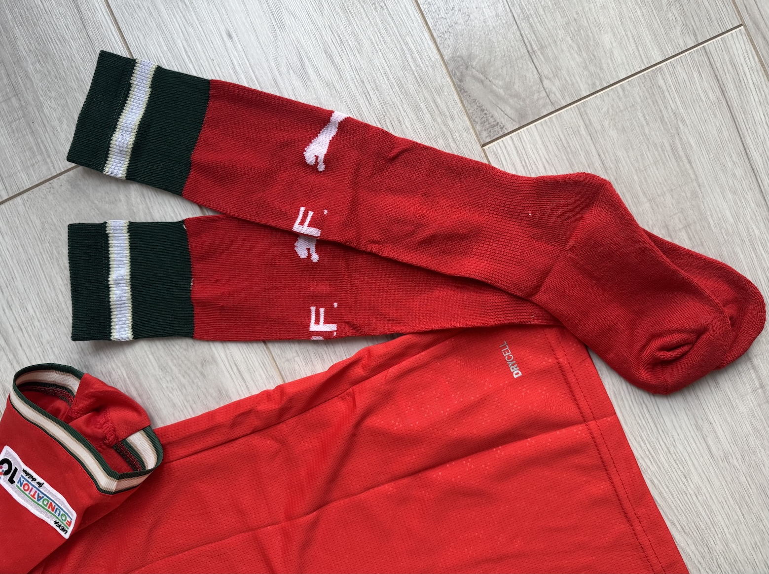 Zestaw nowy, z metkami – pełny komplet: koszulka, spodenki i getry.