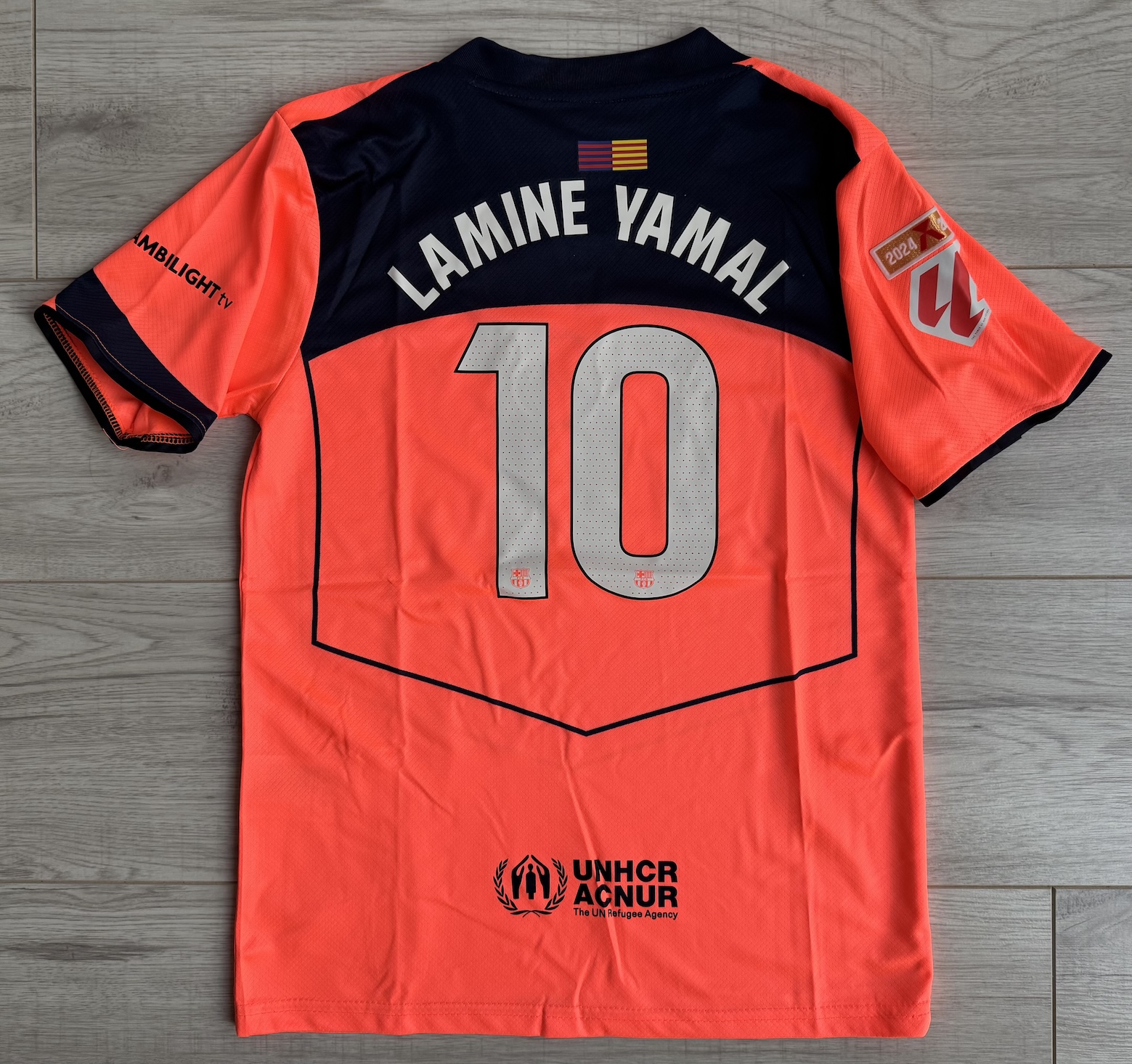 Zestaw składa się z koszulki, spodenek oraz getrów. Na prawym rękawie można wybrać plakietki z LIGI MISTRZÓW (lub można wybrać wersję z LA LIGA) Na plecach można wybrać dowolny numer i nazwisko, np. nr 9 i nazwisko LEWANDOWSKI. Czcionka jest dostosowana do wyboru rodzaju rozgrywek.