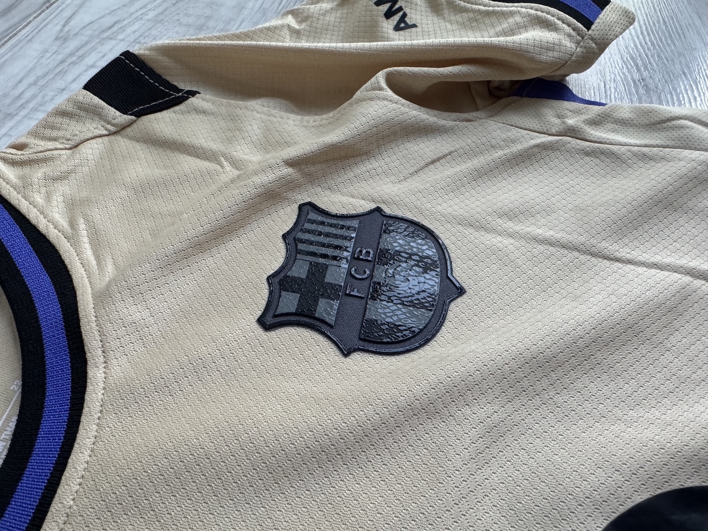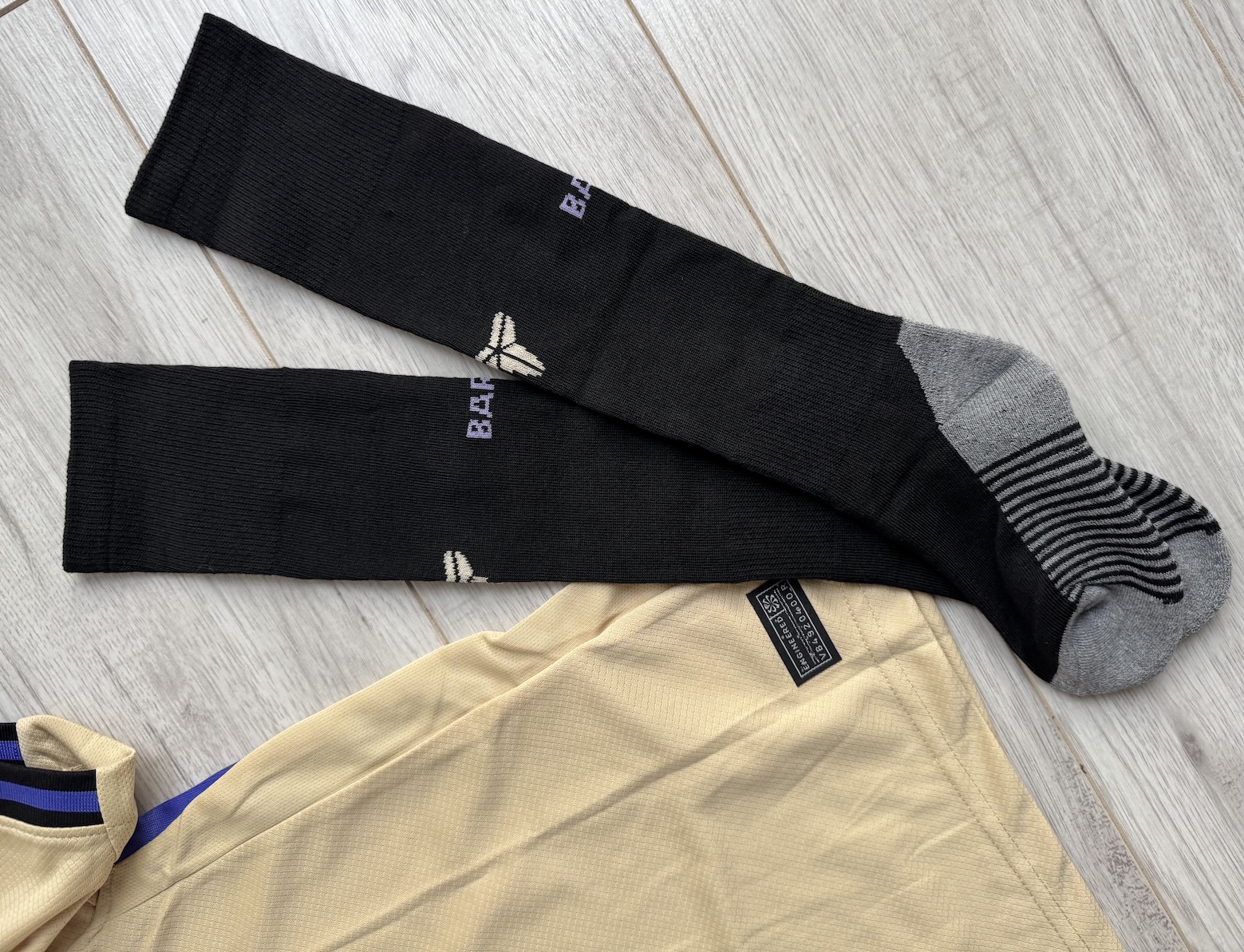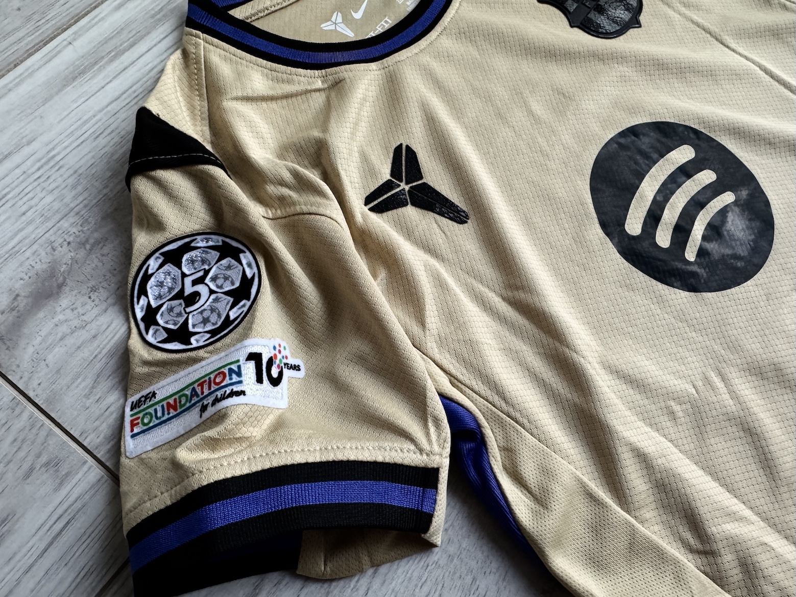Dziecięcy zestaw wyjazdowy FC Barcelony z sezonu 2025/26 to wyjątkowa edycja powstała w kolaboracji z marką Kobe Bryant – Mamba & Mambacita Foundation. Projekt łączy elegancję złoto‑czarnej kolorystyki z hołdem dla legendy światowego sportu. Na koszulce i spodenkach widnieje logo Mamby, symbolizujące dziedzictwo Bryanta i jego pasję do doskonałości. Zestaw w wersji pucharowej 'Black & Gold' z subtelnymi fioletowymi detalami, wykonany w technologii Nike Dri‑FIT, zapewnia doskonałą przewiewność i komfort gry. Na przodzie znajduje się herb FC Barcelony w czarnym wykończeniu, logo Nike i czarne logo sponsora Spotify. Zestaw obejmuje koszulkę, spodenki i getry z logo BARÇA – całość nowa, z metkami.