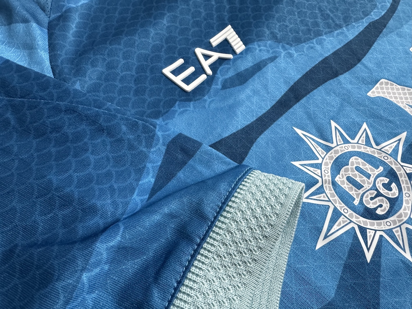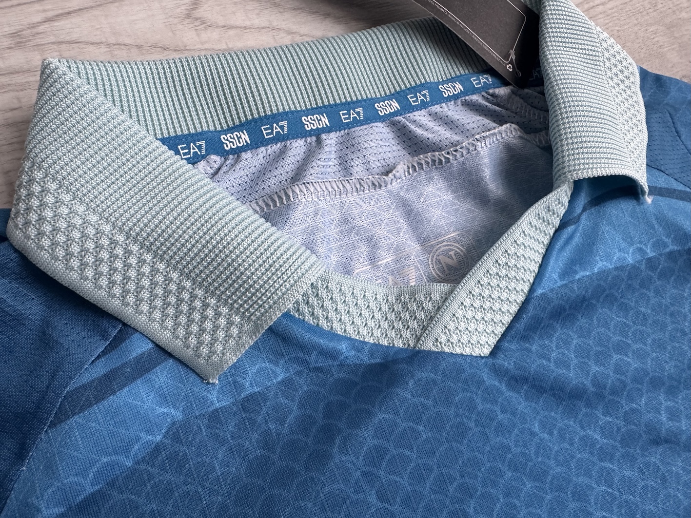 Na prawym rękawie umieszczono oryginalną plakietkę **Serie A TIM**, a na froncie widnieje złoty herb SSC Napoli oraz logo **EA7 Emporio Armani** w limitowanej edycji Parthenope.