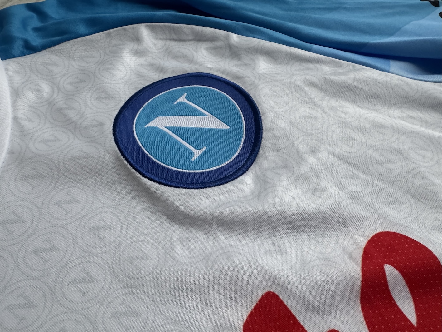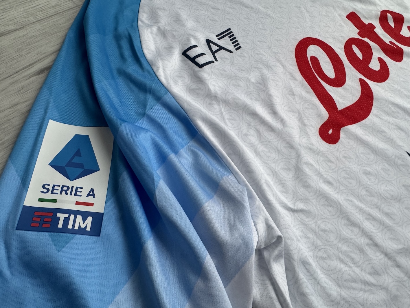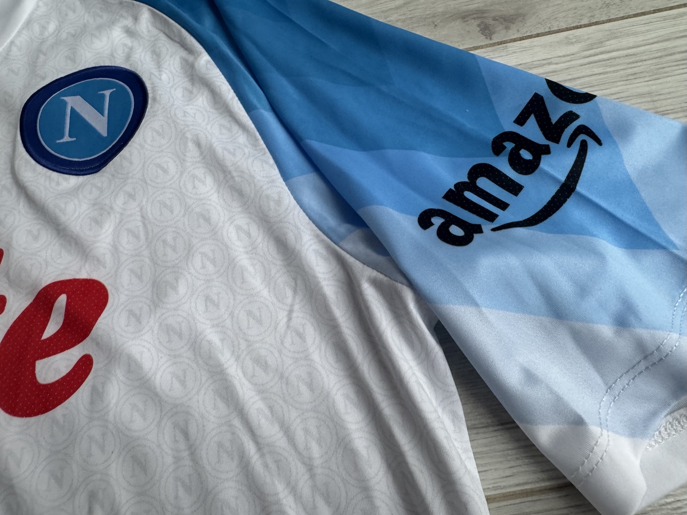 🔵⚪️ Wyjazdowa koszulka **SSC Napoli 2022/23** to elegancki projekt marki **EA7**, łączący biały kolor z dynamicznymi niebieskimi rękawami. Model z jednego z najważniejszych sezonów w historii klubu – mistrzowskiej kampanii zakończonej zdobyciem Scudetto!