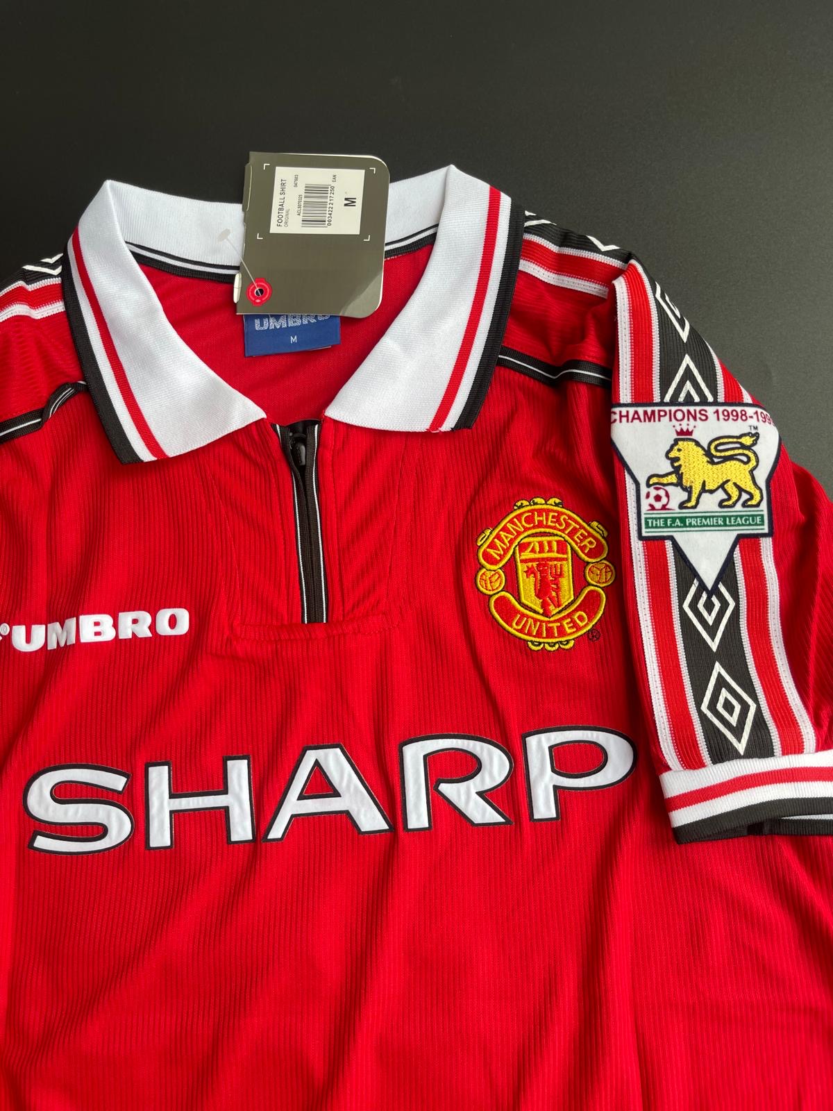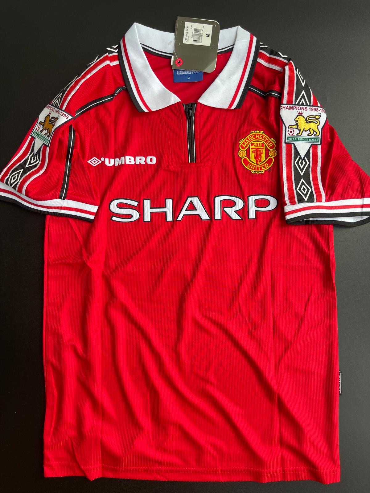 🔴⚫️ Legendarny model **Manchester United Home 1998/99**, kultowy sezon potrójnej korony (Treble): Premier League, FA Cup i Liga Mistrzów. To jedna z najważniejszych koszulek w historii klubu.