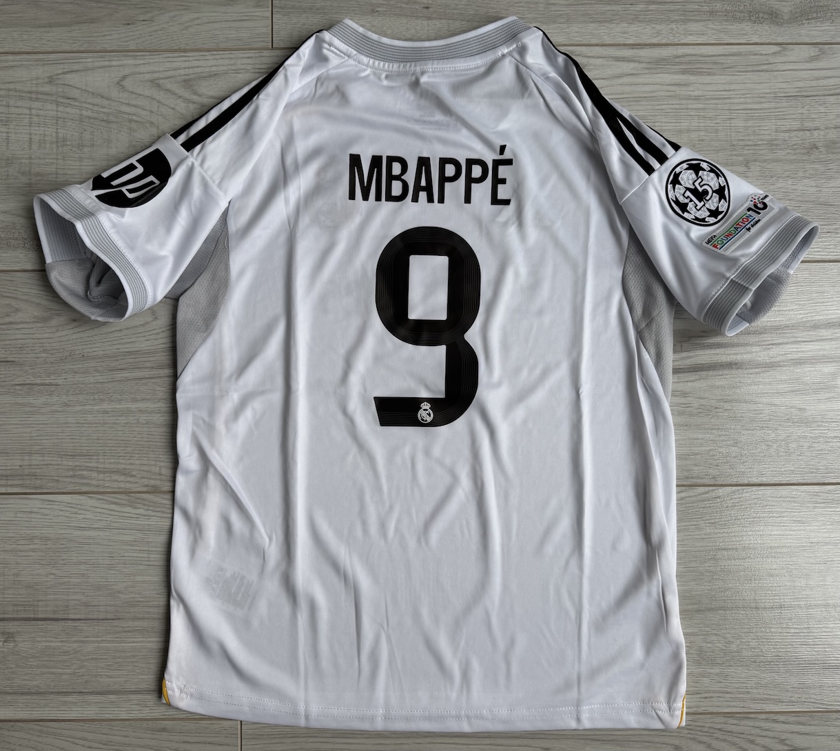 Oficjalny nadruk MBAPPÉ 10 w czarnej czcionce z herbem Realu Madryt pod numerem.