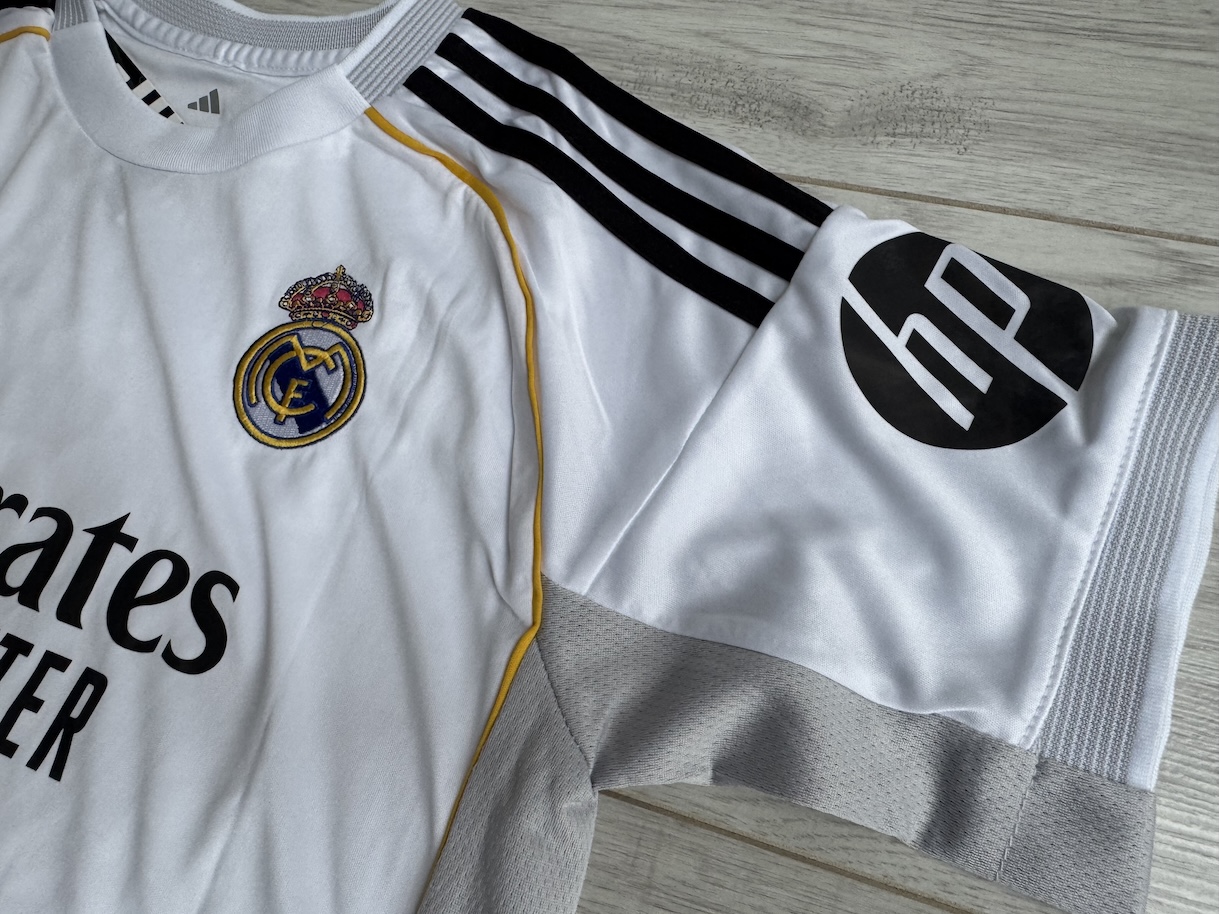 Kompletny zestaw dziecięcy Realu Madryt z sezonu 2025/26 w wersji domowej, czyli klasycznej bieli z subtelnymi złotymi wstawkami, które nadają koszulce wyjątkowej elegancji. Koszulka, spodenki i getry tworzą perfekcyjny komplet, w którym najmłodsi kibice mogą poczuć się jak prawdziwi Galácticos! ⚪️✨ Materiał Adidas AeroReady gwarantuje lekkość, przewiewność i komfort podczas gry i zabawy. Na froncie koszulki widnieje herb Realu Madryt oraz logo sponsora Emirates Fly Better, a całość dopełniają czarne elementy i charakterystyczne trzy paski na ramionach.