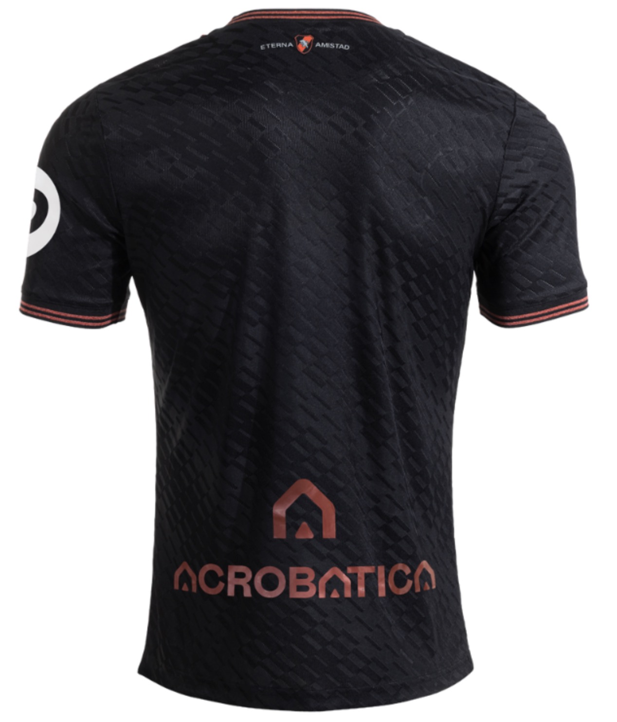 Antracytowo-szara baza koszulki została uzupełniona czarnym diagonalnym pasem, inspirowanym legendarną czerwoną szarfą River Plate. Na tylnej części kołnierza umieszczono hasło ETERNA AMISTAD, podkreślające nierozerwalną więź obu klubów.