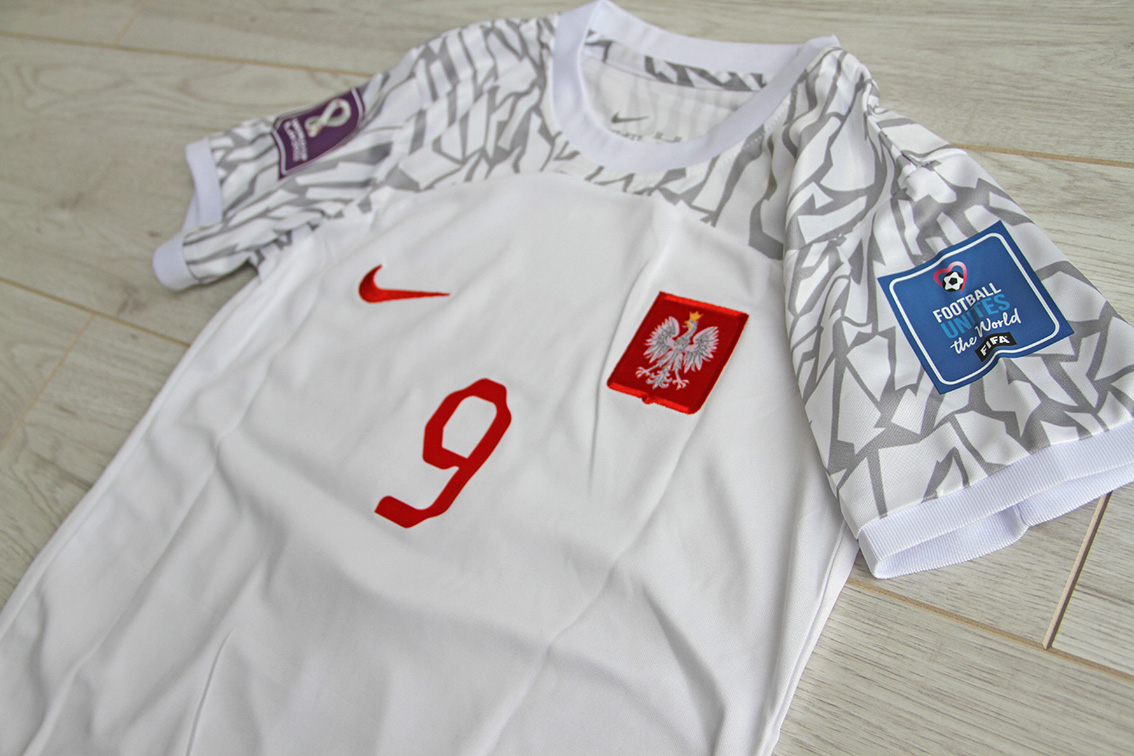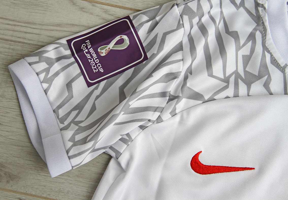 Na rękawach koszulki umieszczono oryginalne plakietki turniejowe: FIFA World Cup Qatar 2022 oraz Football Unites the World, podkreślające mundialowy charakter zestawu.