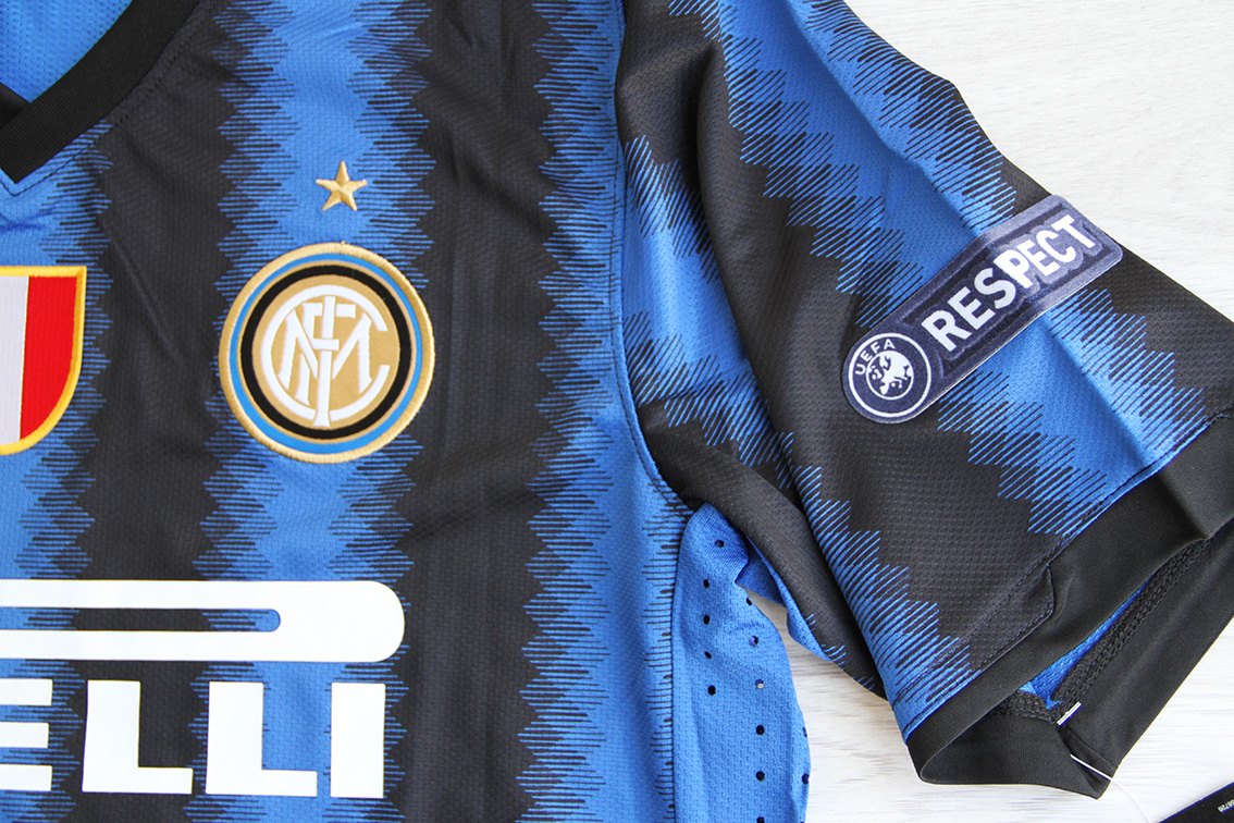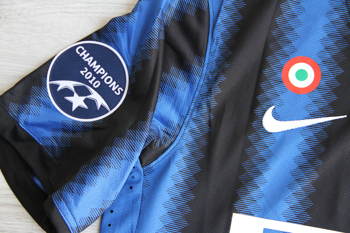 Oficjalne plakietki Ligi Mistrzów UEFA na rękawach, w tym emblemat Champions 2010 upamiętniający triumf Interu w Lidze Mistrzów.