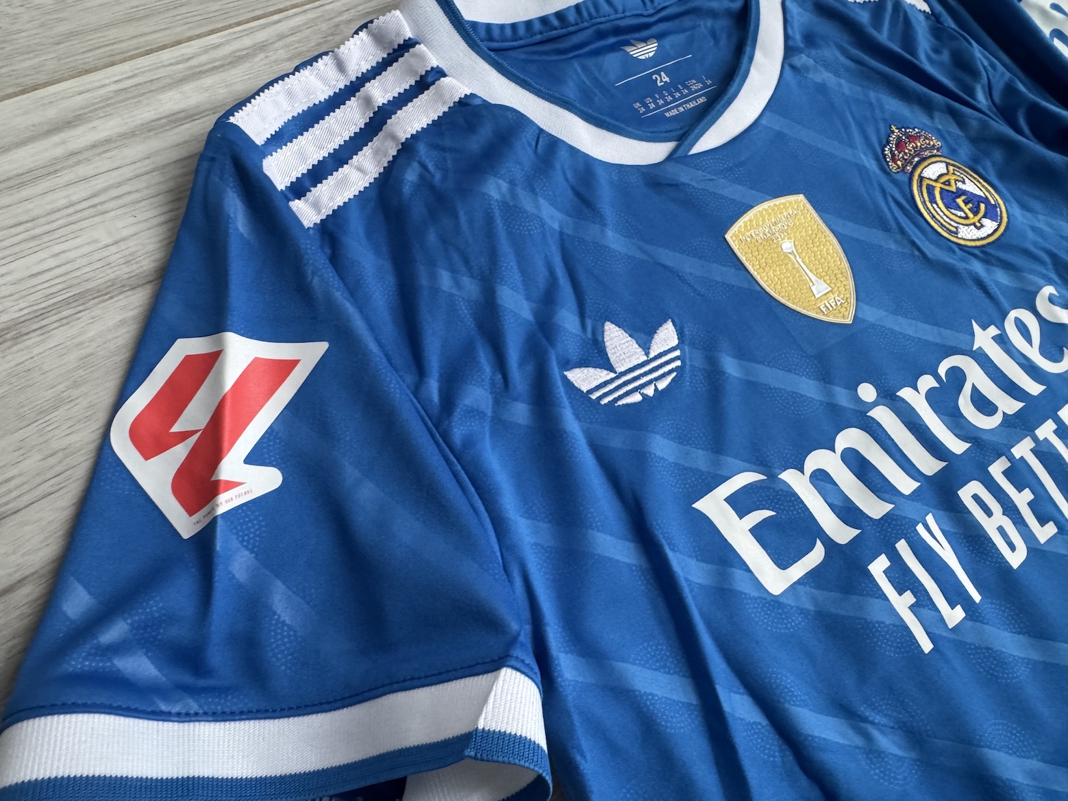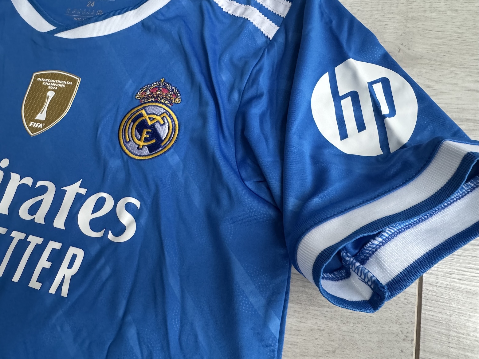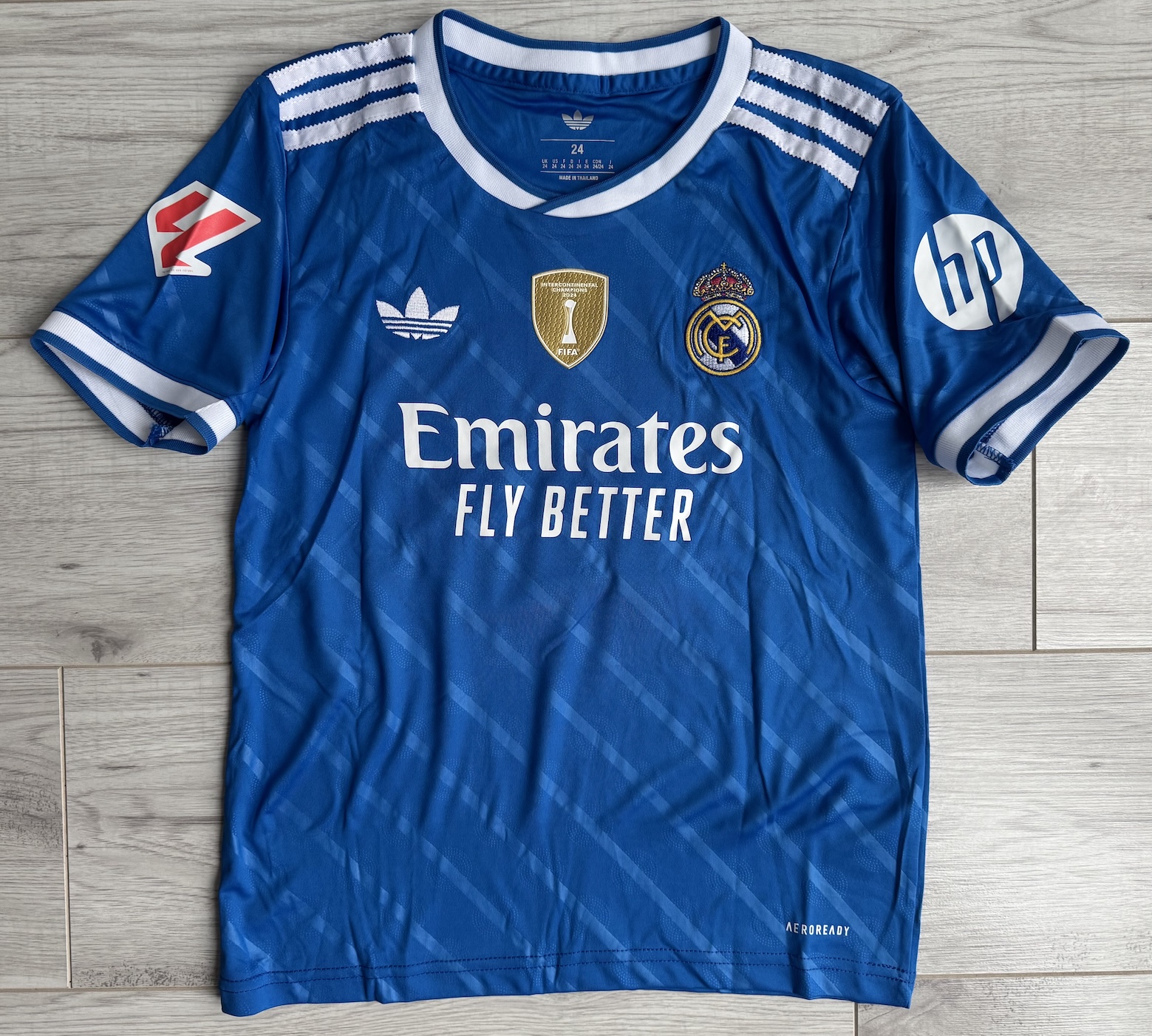 🔹 **PLAKIETKI:** Na prawym rękawie znajduje się oryginalna plakietka **LA LIGA**, a na przodzie złota plakietka **INTERCONTINENTAL CHAMPIONS 2024**. Na lewym rękawie widoczne logo **HP**.